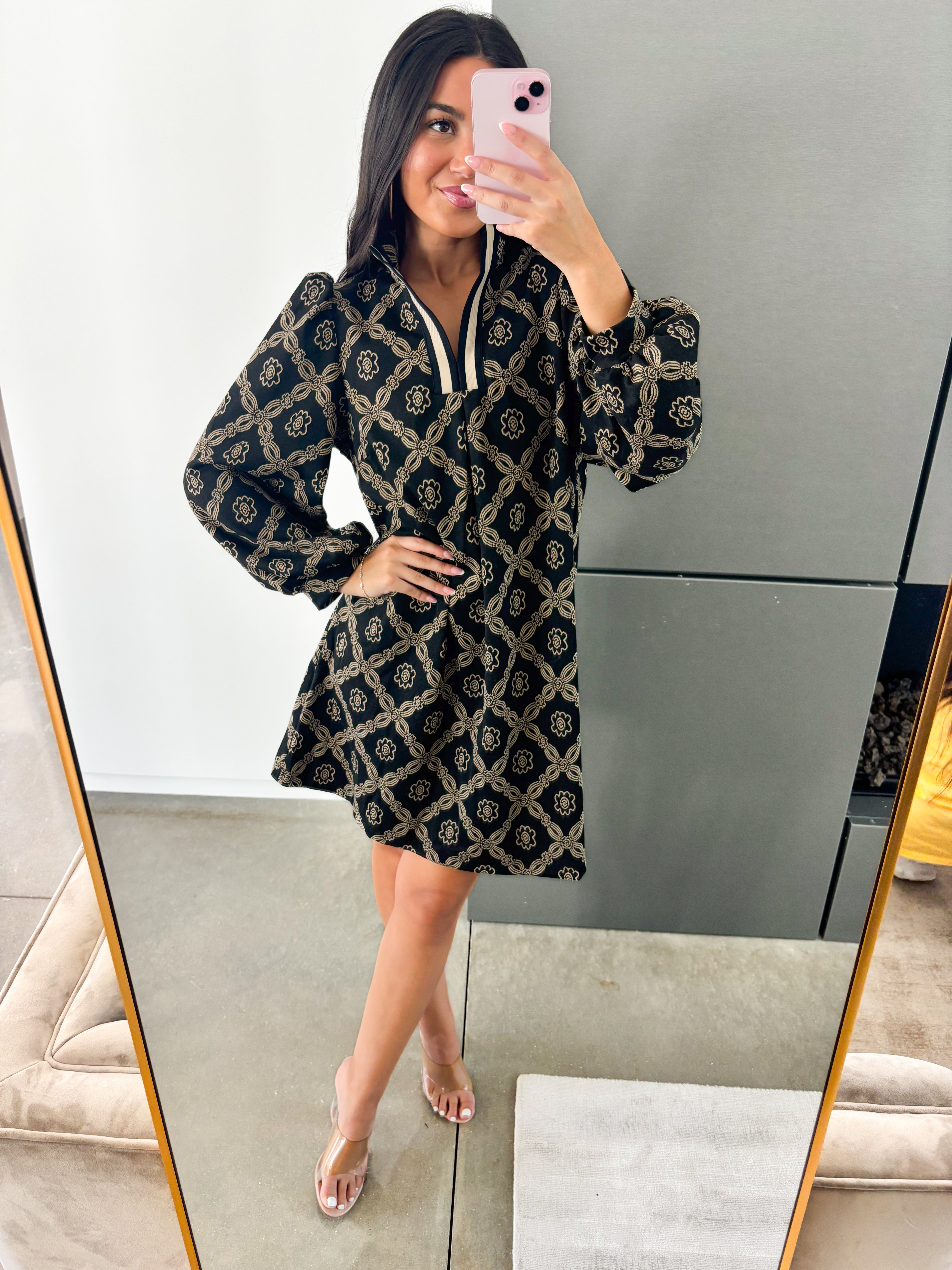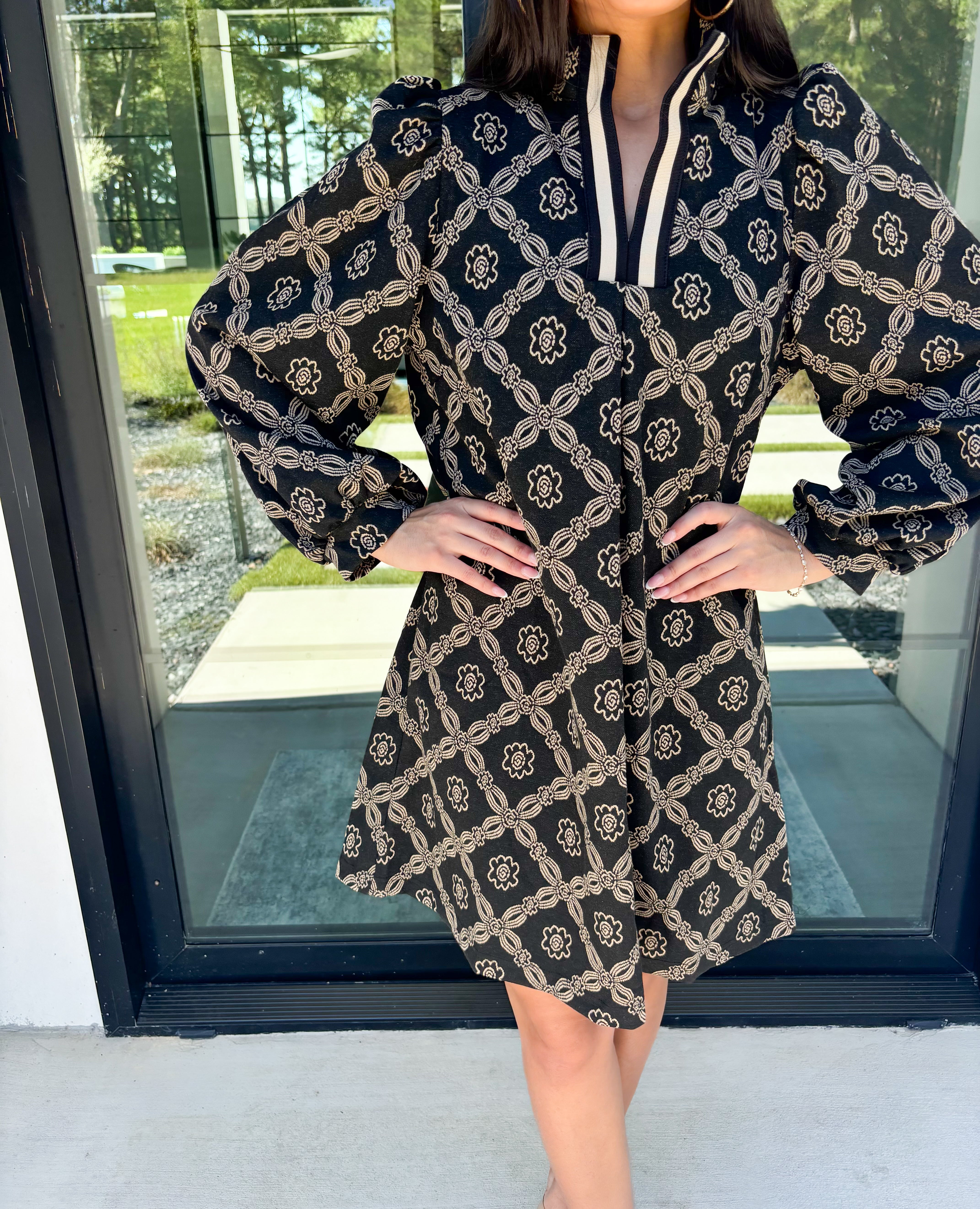 Make every moment unforgettable in the Live In The Moment Geometric Dress—a chic, easy-to-wear piece that blends timeless design with modern flair. Featuring a striking geometric pattern in black and tan, this dress radiates sophistication with a touch of playful charm. The high neckline with contrast trim and puffed sleeves adds structure and elegance, while the flowy A-line silhouette keeps it comfortable and effortlessly flattering. 85% Polyester, 15% Rayon, 3% Spandex.