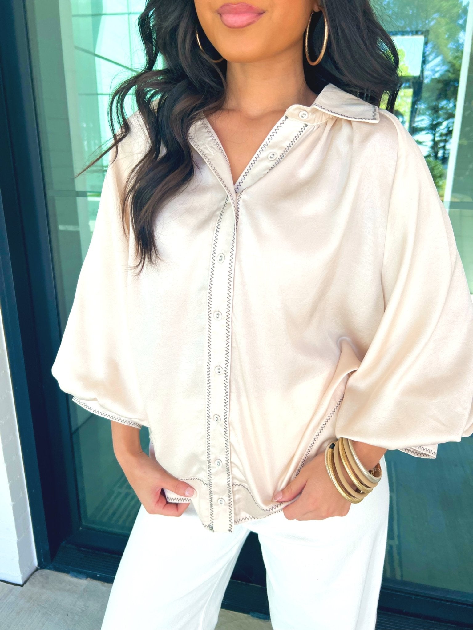 - Ivory button-front blouse